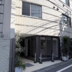 ガラスの扉には入らず、その手前にある左側の階段を降りてください。場所がわからない場合は、インターホンで「106」を押してください。